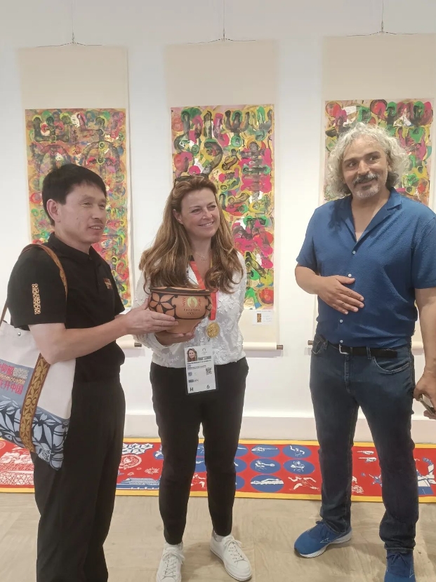 7月25日,在法國巴黎,來自三門峽市的王新軍(左)與現(xiàn)代奧林匹克運(yùn)動(dòng)會(huì)之父顧拜旦的曾孫女黛安·德·納瓦塞爾·德·顧拜旦夫人(中)進(jìn)行文化交流。王新軍作為仰韶彩陶制作技藝的領(lǐng)軍人物,他精心制作了“花開奧運(yùn)”經(jīng)典彩陶盆與廟底溝花瓣紋彩陶盆,參加此次巴黎奧運(yùn)文化體育交流活動(dòng)。
